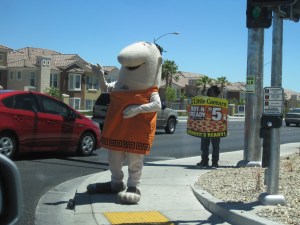 So, the other day when I saw the guy in the Spiderman outfit, I thought that would be the only crazy guy I’d see for a while. Boy, was I wrong! Just today I saw this guy in a Little Ceasar’s Pizza suit on the corner of Ft Apache Rd & Spring Mtn Rd promoting a new pizza place, LOL! It was 109 degrees again today…..the nut jobs keep on coming! I love living in Las Vegas!